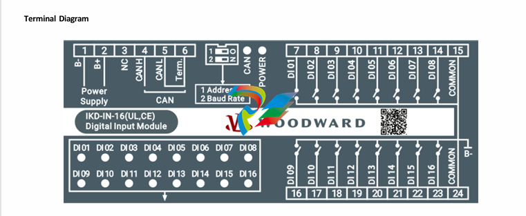 Description: Woodward: IKD-IN-16 (UL, CE), 16 channel discrete input module, 12/24VDC.