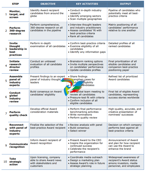Frost & Sullivan analysts follow a 10-step process to evaluate Award candidates and assess their fit with select best practice criteria. The reputation and integrity of the Awards are based on close adherence to this process.