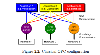 OPC, originally short for “OLE for Process Control”, is an open, standardized software communication interface specification launched in 1996 by a task force of different automation companies, later forming the OPC Foundation. As the former name indicates, OPC is an adaption of Microsoft’s Object Linking and Embedding OLE1 to the process control business, which used to be highly proprietary at that point of time. Thus it was almost impossible to efficiently combine products of different vendors. By providing so-called OPC servers with their devices, buses and software, vendors open their products to any OPC compliant client able to connect to the server for data exchange. Usually, an OPC server can handle several clients at once, while these clients—e.g. visualization or calculation applications—can connect to different servers in order to obtain their needed information.