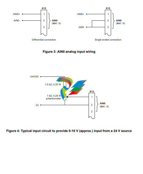 Four 12-bit resolution analog outputs. 4.2.1 Analog inputs The analog inputs are available on connector X12, pins 1 & 2 (AIN0) and 4 & 5 (AIN1).  Differential inputs.