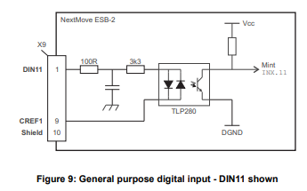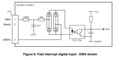 Digital inputs DIN0 to DIN3 can be assigned as fast interrupts. These are used as high speed position latches, allowing any combination of axes to be captured by the hardware. The latency between input triggering and capture is 1 μs. Special Mint keywords (beginning with the letters FAST...) allow specific functions to be performed as a result of fast position inputs becoming active. See the Mint help file for details. Digital inputs DIN0 to DIN3 use CREF0 as their common connection.