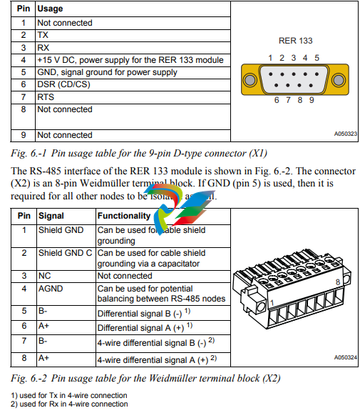 The EIA RS-485 Specification labels the data wires "A" and "B", but many manufacturers label their wires "+" and "-". In our experience, the "+" wire should be connected to the "A" line, and the "-" wire to the "B" line. When wiring RS-485 , use a shielded twisted pair cable with an internal impedance of 100-120Ω. Examples of recommended cables are CAT 5, Belden RS-485 (9841- 9844) and Alpha Wire (Alpha 6222-6230). A050325 Fig. 6.-3 Example on a cable shield connection The shield of the cables must be directly connected to ground in one of the nodes. In the other nodes the connection should be made via a capacitor, i.e. if the shield of the cable is connected to pin 1 in node 1, all the other nodes must be grounded using pin 2.