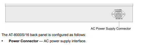• AT-8000S/16 device which supports 16 built-in 10/100Base-T ports, and a Combo port functionality that supports both copper and SFP interfaces.