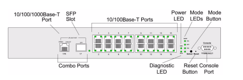 • 1 SFP Port — There is one SFP slot supports either a 100Base-FX or a 1000Base-X (fiber) connection and is designated on the switch as port 17. This SFP slot is paired with the 10/100/1000Base-T copper port which is designated on the switch as port 17R. Together these two ports form the Combo ports shown in Figure 1.