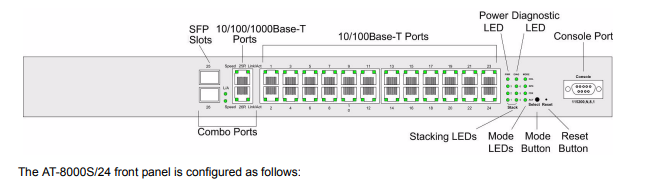 • AT-8000S/24 device with stacking ports which supports 24 built-in 10/100Base-T ports, two Gigabit stackable and 2 Combo Ports, inclusive of a Combo port functionality that supports both copper and SFP interface.