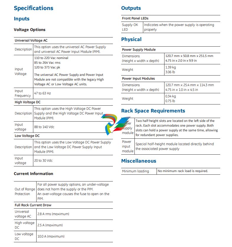 The 3500/15 AC and DC Power Supplies are half-height modules and must be installed in designated slots on the left side of the rack. The 3500 rack can contain one or two power supplies with any combinations of AC and DC. Either supply can power a full rack. When two power supplies are installed in a rack, the one in the lower slot acts as the primary supply, and the other in the upper slot acts as the backup supply. If installed, the second supply is the backup for the primary one. Removing or inserting either power supply module does not disrupt operation of the rack as long as a second power supply is installed. The 3500/15 AC and DC Power Supplies accepts a wide range of input voltages and converts them to voltages acceptable for use by other 3500 modules. The following power supplies are available with the 3500 Series Machinery Protection System: