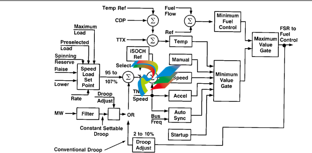 The gas fuel control system is shown schematically in Figure 4. It is a two-stage system, incorporating a pressure control proportional to