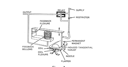 thrust, acting through coil flexures, varies the gap between a flapper and a nozzle. This causes a