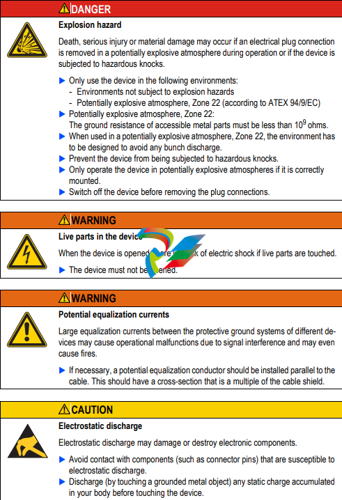 General Hazards may still occur even though the device meets the current state of the art and complies with all recognized safety requirements. The device must only be installed and commissioned in perfect technical condition and in compliance with this document.