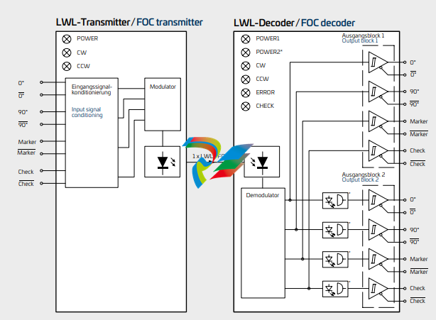 Hierbei werden die parallel anstehenden Signale 0°, 90°, Nullimpuls und LED-Kontrolle im Transmitter kodiert und über nur