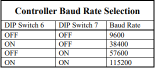 The controller's serial port baud rate is set with controller DIP switches 6 and 7. This