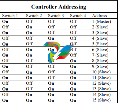 Use DIP switches 1, 2, 3, 4, and 5 to select the controller address. The address is binary