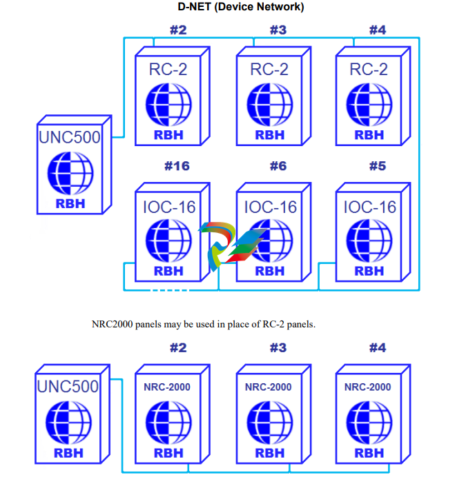 The D-NET connects IOC-16, RC-2, SafeSuite™ panels, PC-100, NRC2000, and