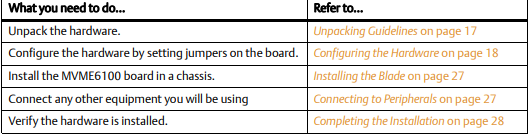 The following table lists the things you will need to do before you can use this board and tells